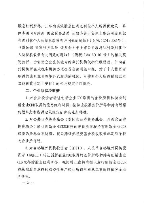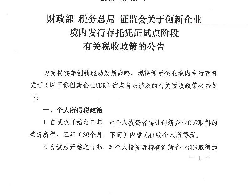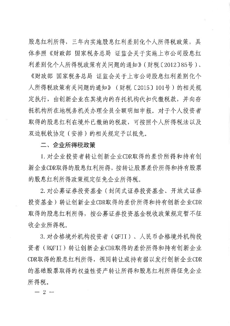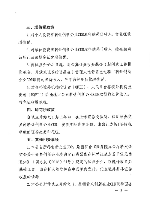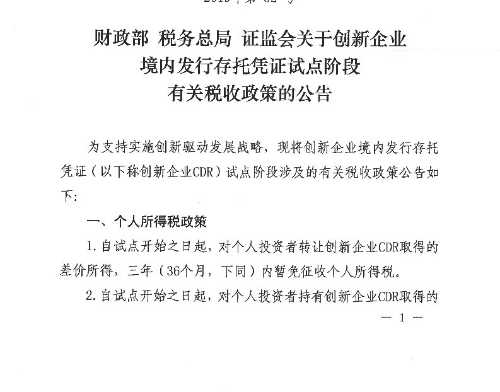 关于创新企业境内发行存托凭证试点阶段有关税收政策的公告