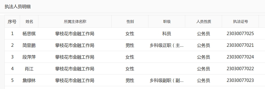 攀枝花市金融工作局执法人员名单